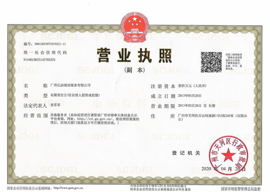 廣州億潔清潔服務(wù)有限公司是經(jīng)廣州市工商行政管理局批準(zhǔn)成立的(注冊(cè)資本:100萬元人民幣)。具有獨(dú)立法人資質(zhì)。公司成立2015年,公司具備完善的管理體系和高素質(zhì)管理隊(duì)伍,擁有特種技術(shù)人員33名,保潔服務(wù)人員上萬名,覆蓋廣州市,能及時(shí)調(diào)配并快速投入高效運(yùn)行。我們的每個(gè)員工都經(jīng)過公司的嚴(yán)格篩選,嚴(yán)格培訓(xùn),定期培訓(xùn)后持證上崗以保證服務(wù)品質(zhì),保障客戶的權(quán)利,利益,形象等不受損失。 廣州億潔清潔公司是一家設(shè)備齊全,技術(shù)強(qiáng)大的綜合型清潔服務(wù)公司,為客戶提供完善服務(wù)尊定了堅(jiān)定的基礎(chǔ)。 司于2010年全面推行了ISO9001質(zhì)量管理體系認(rèn)證和ISO14001國際環(huán)保體系認(rèn)證。先后獲得廣州高層建筑外墻清洗維修作業(yè)【安全資質(zhì)證書】、【廣州環(huán)衛(wèi)企業(yè)等級(jí)證書C級(jí)資質(zhì)】、廣州疾控中心頒發(fā)的【四害消殺服務(wù)資質(zhì)證】、【空氣治理A級(jí)資質(zhì)】、中國石材協(xié)會(huì)頒發(fā)的【石材資質(zhì)B級(jí)資質(zhì)】等。 廣州億潔清潔服務(wù)有限公司致力于打造專業(yè)、實(shí)惠、靠譜的保潔服務(wù)公司,把專業(yè)的事情交給專業(yè)的我們,您放心! 億潔清潔服務(wù)項(xiàng)目: 廣州保潔服務(wù):新建樓宇、別墅、酒店、醫(yī)院、辦公樓、賓館、企事業(yè)單位廠房竣工后開荒及裝修后精細(xì)保潔.工程保潔服務(wù)。 廣州物業(yè)托管:為廣州市各大企事業(yè)單位、賓館、政府機(jī)關(guān)、小區(qū)物業(yè)、酒店及廠房提供專業(yè)化保潔、園林、設(shè)施維護(hù)等管理服務(wù)。 廣州高空作業(yè):高空玻璃幕...[詳情]